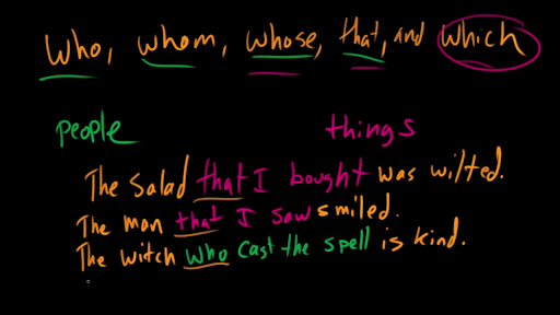 English are who, whom, whose, that and which, and we use them all for different things. So, we can use who, whom, whose and that to refer to people, and we can use whose, that and which to refer to things. Let me show you. You could say, the salad