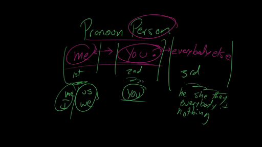 everybody else involved? Right, so both me and us or I and we are first person pronouns, because they're about me or a group that contains me. Likewise, you is the second person. That's kind of it, both