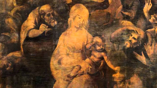 front of an unfinished painting by Leonardo da Vinci. It's a big painting. And interestingly, it's