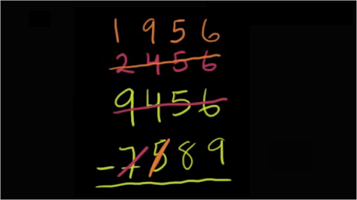 I want to show you a way that at least I find more useful to subtract numbers in my head and I do it this way not it's not necessarily faster on paper but it allows you to remember what you're doing because if you start borrowing and stuff it becomes very hard to remember what's actually going on so let's try out a couple of problems let's have nine thousand four hundred and fifty six minus seven thousand five hundred and eighty nine so the way I do this in my head I say the nine thousand four hundred and fifty six minus seven thousand five hundred eighty nine you have to remember the two numbers so the first thing I do is I say well it's just what's nine thousand four hundred and fifty six minus just seven thousand right that's pretty easy because I just take nine thousand minus seven thousand so what I can do is I'll cross out this and I'll subtract seven thousand from it and I'm going to get two thousand four hundred and fifty-six so in my head I tell myself that nine thousand four hundred and fifty six minus seven thousand five hundred eighty nine is the same thing as if I just subtract out the seven thousand as two thousand four hundred and fifty-six minus 589 right I took the seven thousand out of the picture I essentially subtracted it from both of these numbers now if I want to do two thousand five for two thousand four and fifty six minus five hundred eighty nine what I do is I subtract five hundred from both of these numbers so if I subtract five hundred from this bottom number this five will go away and if I subtract five hundred from this top number what happens what's two thousand four hundred fifty six minus five hundred or an even easier way to think about it what's 24 minus five well it's nineteen so it's going to be 1919 hundred and fifty-six let me scroll up a little bit so it's 1956 so my original problem has now been reduced to 1956 minus 89 now I can subtract 80 from both that number and that number so if I subtract 80 from this bottom number the eight it disappears right 89 minus 80s just nine and I subtract 80 from this top number I can just think of what's 195 minus eight well 195 mind eight let's see 15 minus 8 is 17 so 195 minus 8 is going to be 187 and then you still have the 6 there so essentially I said 1956 minus 80 is 1876 and now my problem has been reduced to 1876 minus 9 and then we can do that in our head what's 76 minus 9 that's what 67 so our final answer is 1867 and as you can see this isn't necessarily faster than the way we've done it in other videos but the reason why I like it is it at any stage I just have to remember two numbers I have to remember my new top number and my new bottom number my new bottom number is always just some of the leftover digits of the original bottom number so that's how I like to do things in my head now just to make sure that we got the right answer maybe to compare and contrast a little bit let's do it the traditional way nine thousand four hundred and fifty six minus seven thousand five hundred and eighty nine so the standard way of doing it I like to do all my borrowing before I do any of my subtraction so that I can stay in my borrowing mode or you can think of it as regrouping so I look at all of my numbers on top and see are they all larger than the numbers on the bottom and I started here at the right six is definitely not larger than nine so I have to borrow so I'll borrow ten or I'll borrow one from the tens place which ends up being 10 so the six becomes a 16 and then the five becomes a four then I go to the tens place for needs to be larger than eight so let me borrow one from the hundreds place so then that four becomes a 14 right or 14 tens because we're in the tens place and then this four becomes a three now these two columns or places look good but right here I have a three which is less than a five not cool so to borrow again that three becomes a 13 and then that nine becomes an eight and now I'm ready to subtract so you get 16 minus 9 is 7 14 minus 8 is 6 13 minus 5 is 8 8 minus 7 is 1 and lucky for us we got the right answer and now you know I want to make it very clear there's no better way to do this the this way is actually kind of longer and takes up more space on your paper than this way was but this for me is very hard to remember it's very hard for me to keep track of what I borrowed and what another number is and etc etc but here at any point in time I just have to remember two numbers and the two numbers get simpler every step that I go through this process so this is why I think that this is a little bit easier in my head but this might be depending on the context easier on paper but at least here you doesn't have to borrow or regroup well hopefully find that a little bit useful
