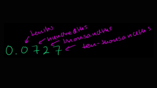 let's see if we can write 0.072 seven as a fraction now let's just think about what places these are in this is in the tenths place tents this is in the hundreds place hundreds hundreds place this two is in the thousands place thousands and this seven right here this last seven is in the ten thousands place ten thousands so there's a couple of ways we can do this the way I like to think of this this term right over in the ten thousands place we can view this whole thing right over here 727 ten thousands because this is the smallest term or the smallest place right over here so let's just rewrite it this is equal to 727 over 10,000 over 10,000 and we've already written it as a fraction and I think that's about as simplified as we can get this number up here is not divisible by two it's not divisible by five in fact it's not divisible by three which means it would be divisible by six or nine doesn't even look to see you two seem to be divisible by seven it might be a prime number but I think we are done