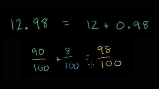 let's see if we can write 12-point 0.98 as a mixed number so the first thing you might want to realize here is that this is the exact same thing as 12 plus 0.98 and this simplifies it because then we just have to write it as 12 and some fraction that's the same thing as 0.98 so if we can write 0.98 as a fraction then we could we're essentially we're almost done so let's see if we can do that so this 9 right over here is in the tenths place I'll just write it like that tenths place and this right over here is in the hundredths place it's in the hundreds place so you could view 0.98 two different ways you could view it as 9/10 9/10 that's this part right over here 9/10 plus plus 8 hundredths plus 8 hundredths and if you want to find a common denominator that would be the same thing as 90 over 100 plus 8 over 100 plus 8 over 100 which is equal to 98 over 100 equal to 98 over 100 and so 9 0.98 is 98 hundreds and another way you could have said that is look this space right over here is in the hundreds place and so this is 98 hundredths or 9800 so you could have skipped this right over here so if we just wanted to write it as a mixed number we could just write it as 1212 and instead of 0.98 12 and 98 hundredths now we have introduced this to lowest terms yet so let's see if we can simplify this 98 is divisible by 2 and so is 100 so let's divide both of them by 2 they have that common factor so we're going to divide both of them by 2 and so this is the same thing as 12 and 98 divided by 2 is 49 100 divided by 2 is 50 and I think that's about as far as we can do 49s factors it's divisible by 7 but 50 isn't so we've put it in lowest terms so 12 point 9 8 can be written as a mixed number 12 and 49 50 it's