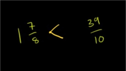 I've got pairs of mixed numbers and improper fractions and I want to think about which of the two is larger so one in seven eights 39 over 10 so you could do this in your head you could say 10 goes into 39 I'll even write out 10 goes into 39 3 times 3 times 10 and you want to find the largest number of times 10 goes into this without going over so if you couldn't write a 4 over here because then that would be 40 that would go over 39 3 times 10 is 30 and then you have a remainder of 9 so you could rewrite this expression right over here instead of 39 over 10 you could write it as 30 over 10 plus 9 over 10 and 30 over 10 is just 3 so this is equal to 3 and 9/10 and you could do that in your head you could say 10 goes into 39 3 times and the remainder is 9 you have your 9/10 and that's essentially just doing this in your head so now we can compare and we can literally just look at the whole number part this is 1 and something 1 in 7 eighths and we're comparing it to essentially 3 and nine-tenths 3 and 9/10 is clearly a larger number we have a 3 out here instead of a 1 so we will write less than and the way I always remember it is the opening always faces the larger number the opening is large it faces the larger number and the point is small it always points to the smaller number now let's do this next one four and 7/8 versus 49 over 9 so let's convert this to a mixed number nine goes into 49 five times and 5 times 9 is 45 so the remainder is going to be 4 the remainder is 4 so this is 5 and 4/9 once again we can literally just look at the whole number parts 5 is clearly larger than 4 so once again less than point facing the smaller number opening facing and the larger number now two-and-a-half versus 11 tense 10 goes into 11 only one time and if you care about the remainder it's 1 so it's 1 and 1/10 which is clearly smaller than 2 and 1/2 you just look at the whole number parts 2 is clearly larger than 1 so we want our opening the of our less-than or greater-than sign to face the the larger number so we would write it like this and this is greater than so two and a half is greater than eleven tenths the little point facing the smaller number 5 and 4/9 versus 47 47 7 goes into 40 so let me rewrite this 7 goes into 40 five times and then you're going to have a remainder of 5 because 7 times 5 is 35 you have a remainder of 5 to get to 40 so it's five and five sevens and if that looks like I'm doing some type of Voodoo just remember I'm really just breaking it up I'm just really saying that 40 over seven is the same thing as 35 plus five over seven the largest multiple of seven that is less than this number and this is the same thing as 35 over seven plus five sevens and then this 35 over seven is five and five sevenths is just five sevenths there this one is interesting because we have the same whole number out front on our mixed numbers five versus five so now we actually do have to pay attention to the fractional part of our mixed number we essentially have to compare 4/9 for nine to five sevens and there's a couple of ways to do this you could get them to have the same denominator that's probably the easiest way to do it so you could rewrite so what's the least common multiple of nine and seven they share no factors so really the least common multiple is going to be their product so if we want to rewrite 4/9 we would write 63 in the denominator that's nine times seven if we multiply the denominator by seven we also have to multiply the numerator by seven so that will be 28 now 5/7 we're going to make the denominator 63 we're multiplying the denominator times nine then we have to multiply the numerator times nine as well five times nine is forty-five so here it's easy to see 45 over 63 is clearly larger than 28 over 63 and so we could write this and because the whole number of parts are the same and 5/7 is the same thing as 45 45 60 thirds and 4/9 is the same thing as 2860 thirds we can write it that 5 and 4/9 is less than 40 over 7 another way that you could have thought about 4 ninths versus 5/7 you could have said well how does 4/9 how does 4/9 compared to 4/7 we have the same numerator the denominator here is large in the denominator here but when you have number in the denominator the larger it is a smaller the fraction the smaller the absolute value of the fraction so this right over here is a smaller quantity than four sevens and 4/7 is clearly a smaller quantity than 5/7 so 4/9 is clearly smaller than 5/7 so we would have gotten the same result