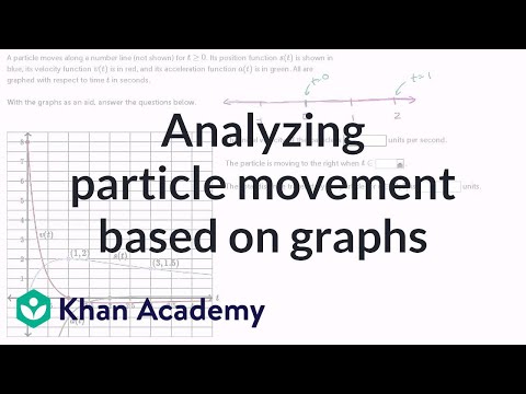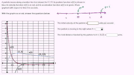 a particle moving moves along a number line not shown 40 is greater than or equal to zero its position function s of T is shown in blue so this is its position as a function of time its velocity function V of T is in red its velocity and its acceleration function a of T is in green all are graphed with respect to time T in seconds with the graphs as an aid answer the questions below so that's what's going on here so its position as a function of time actually let me just draw their number line that they did not depicts just so we can really think about this so let's say this is our number line let's say that this right over here is the that's 0 that's 1 that is 2 this is negative 1 so we're defining going to the right as the positive direction so what's happening here so at time equals 0 at time equals 0 right over here time equals 0 s of 0 is 0 and then as time increases our position increases all the way until time equals 1 at time equals 1 our position is 2 so time equals 1 our position is 2 and then our position and then s of T starts decreasing so we start it one way to think about it is and you see we move up we move we move to the right really fast we get to 2 we stop at 2 and then we start moving to the left so one thing so time equals 0 the first second looks like this resume well slow down and stop and then we start moving the other way and then we start drifting notice our position is good is is decreasing so our position is decreasing but it's decreasing it ever slower slower and slower and slower rates it's not clear if we'll ever get back to the origin so that's what's going on here and we see that no matter which graph we look at our position function is definitely telling that story our velocity function which is the derivative of the position function is telling you that story out the gate we have a we have a high positive velocity but we decelerate quickly and at 1 second our velocity is 0 and then we start having a negative velocity which means we're moving to the left so fast rightward velocity but we decelerate faster driver to decelerate quickly stop at time equals one second and then we start drifting to the left and the acceleration also also shows that same narrative but anyway let's actually answer the questions the initial velocity of the particle is blank units per second I encourage you to pause this video and answer that well we just said the velocity lets see a time equals zero we're at eight units per second so I'll just put eight right over there the particle is moving to the right when T is a part of or when T is in the interval and they're since they're doing this as a member of they really want this kind of in the set notation T is a member of the interval well when are we moving to the right we already went over that we're moving to the right there's a couple of ways to think about it when our velocity is greater than so we're moving to the right when V of T is greater than zero when V of T is less than zero we're moving to the left when V of T is equal to zero with stationary so when is V of T greater than zero well it's between T is between T being zero velocity is definitely positive all the way to T is one but not including T is one so I'll put a parenthesis there so this is equivalent to saying so T is a member of that interval is equivalent to saying that zero is less than or equal to T is less than is less than one once again the first second we're going at time zero we're going fast slowed down and then stopped for a infinitesimal moment and then we start drifting back that happens at time equals one we start drifting back the total distance traveled by the particle for T in the interval between zero and three is blank units so once again I encourage you to pause the video and try to answer that the total distance so this is interesting don't get consistence confused with displacement if I if I were to move three to the right and then I were to move back one to the left the total distance I've traveled is four the distance I traveled is four while the displacement while the displacement would be a positive and we could make put a minus 1 there we moved one to the left so three to the right one to the left while our displacement would be a net of positive to our displacement would be a positive two so they're asking what's the total distance traveled so between time 0 and time 1 between time 0 and time 1 we have moved we have moved to to the right we've moved to to the right we've moved to to the right and then between time 1 and time 3 we move back or to the left we move half so to the left we move we move half so what's our total distance it's going to be 2 to the right plus 1/2 to the left which is going to be 2 point 5 units 2 to the right plus 1/2 to the left 2 point 5 units and we're done