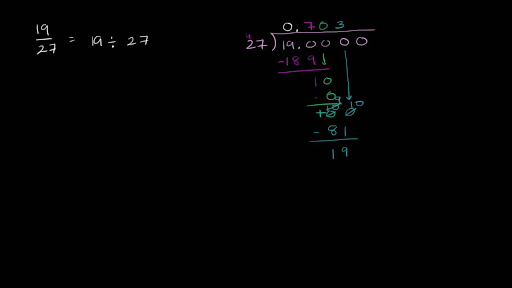 express the rational number 19 over 27 or 1927 as a terminating decimal or a decimal that eventually repeats include only the first six digits of the decimal in your answer let me give this a shot so we want to we want to express 19 over 27 which is the same thing as 19 divided by 27 as the decimal so let's divide 27 into 19 so 27 going into 19 and we know it's going to involve some decimals over here because 27 is larger than 19 and it doesn't divide perfectly so let's go into get into this so 27 doesn't go into 1 it doesn't go into 19 it does go into 190 and it looks like 27 is roughly 30 it's a little less than 30 and 30 times 6 would be 180 so let's go with it going 6 times let's see if that works out well 6 times 7 is 42 6 times 2 is 12 plus 4 is 16 and when we subtract 190 minus 162 is going to get us actually we could have add another 27 in there because when we subtract so we get a 10 from the tens place so that becomes 8 tens this became 28 so we could have put one more 27 in there so let's do that so let's put one more 27 in there so 727s 7 times 7 is 49 7 times 2 is 14 plus 4 is 18 and now our remainder is 1 we can bring down another 0 you can bring down another 0 27 goes into 10 0 times 0 times 27 is 10 subtract with remainder of 10 but now we get to bring down another 0 so let's bring down this 0 right over here so now 27 it goes into 100 3 times 3 times 27 is 60 plus 21 is 81 81 3 times 7 yep 21 81 and then when we subtract 100 minus 81 well we could take 100 from the hundreds place and make it 10 tens and then we could take one of those tens from the tens place and make turn it into ten ones and so nine minus nine 10s minus eight tens is equal to 110 and then 10 minus 1 is 9 so it's equal to 19 you probably you might have been able to do that in your head and then we have and I see something interesting here because we bring down our next 0 we see 190 again we saw 190 up here but let's just keep going so 27 goes into 190 we already we already played this game it goes into it seven times seven times 27 we already figured out was 189 we subtracted you have two remainder of one then we brought down another zero bring down another zero we said 27 goes into 10 zero times zero times 27 is zero subtract then you have still have the 10 but we got to bring down another zero we got to bring down another zero so you have 27 goes into 100 we've already done this three times so you see something happening here it's zero point seven zero three seven zero three and we're just going to keep repeating seven zero three this is going to be equal to zero point seven zero three seven zero three seven zero three seven zero three on and on and on forever so the the the notation for representing a repeating decimal like this is to say this is zero point seven zero three and you put a line over the part that's going to repeat so you put a line all over the seven the zero and the three so this means that the seven zero three will keep repeating on and on and on so let's actually input it into the exercise now so it's zero point seven zero three seven zero three and they tell us to include only the first six digits of the decimal in your answer and they don't tell us to round or approximate because obviously if they said round to that that's that smallest six the decimal place then you would round up because the next digit is a seven but they don't ask us to round they just say include only the first six digits of the decimal in your answer so that should do the trick and it did you
