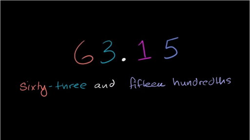 we're asked to write this right here in Word form and I'm not saying it out loud because that would give the answer away we have six 3.15 that we want to write in Word form well the stuff to the left of the decimal point is pretty straightforward let me actually color code it so we have six three and then we have a let me do it all in different colors six three and then we have a decimal and then we have a one and A five one and A five now there's really well there's one common way of doing this but we'll talk about the different ways you could express this as a word but we know how to write this stuff to the left this is pretty straightforward this is just 63 so let me write that down so this is 60 63 63 and instead of the decimal will write and and now there's two ways to go here we could say and one tenth and five we could say and one tenth and five hundredths or we could just say look this is 15 hundredths one tenth is ten hundredths so one tenth and five hundredths is 15 hundredths so maybe I could write it like this sixty-three and 15 15 hundredths hundreds hundreds just like that now a it might have been a little bit more natural say how come I don't say one tenth and then five hundredths and you could but that would just make it a little bit harder for someone's brain to process it when you say it so you could have it could have been 63 so let me copy and paste that copy and paste it could be 63 and and then you would write and then you would write 1/10 1/10 for this digit right there and and five hundredths and five hundredths five hundredths 500 s and I think you can appreciate that this is a little bit you know sixty three and one tenth and five hundredths is a hard is hard for most people's brains to process but if say 1500s people get what you're saying this right here let me not to beat a dead horse but this right here this is one tenth right here and then this is five hundredths this is five hundredths five over 100 but if you were to add these two if you were to add one tenth plus 500 so let's do that if you were to add one tenth plus five hundredths plus five hundredths how would you do it well you need a common denominator 100 is divisible by both 10 and 100 so multiply both the numerator and denominator of this character by 10 you get 10 on the top and 100 on the bottom 1/10 is the same thing as 10 over 100 10 hundredths plus 5 hundredths is equal to 15 over 100 so this piece right here is equal to 15 over a hundred and that's why we say 63 and 15 hundredths