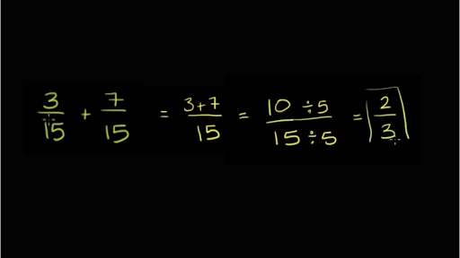 so we're asked to add three 15 s plus 7 15 s and then simplify the answer so just the process when you add fractions is if they already well first of all if they're not mixed numbers and neither of these are and if they have the same denominator in this in this example the denominators are already the same the denominator is 15 so if you add these two fractions your sum is going to have the same denominator 15 and your numerator is just going to be the sum of the numerator so it's going to be 3 plus 7 or it's going to be equal to 10 over 15 now if we wanted to simplify this we look for the greatest common factor in both the 10 and the 15 and as far as I can tell 5 is the largest number that goes into both of them so divide the 10 by 5 so you divide the 10 by 5 and you divide the 15 by 5 and you get 10 divided by 5 is 2 and 15 divided by 5 is 3 you get 2/3 now to understand why this works let's draw it out let's draw let's let's split something up into 15 sections so let me split it up into 15 sections let me see how well I can do this well actually even a better way an easier way might be to draw circles so well let me do the 15 sections so let me draw so that is one section right over there that is one section and then if I copy and paste it so let me copy and then let me paste it that is a second section and then third section fourth section fourth section and then we have a fifth section let me copy and paste this whole thing so that's five sections right there so let me copy and then paste that so that is ten sections and then let me do it one more time so that is 15 section so you can imagine this whole thing is like a candy bar or something and we have now split it up into 15 sections now what is 315 well it's going to be 3 of the 15 sections so 315 so it's going to be 1 two three three fifteen now to that we're adding seven of the 115th sections or seven of the sections so we're adding seven of those to it so that's one two three four five six seven and you see now if you take the orange in the blue you get one two three four five six seven eight nine ten of the sections or 10 of the 15 sections and then to see why this is the same thing as 2/3 you can just split this candy bar into thirds so each third would have five sections in it so let's do that one two three four five so that is 1/3 right there one two three four five that is another third right there and notice when you do it like this we have filled out exactly two 1/2 of the thirds this is the third third but that's not filled in so 10 15 is the same thing as 2/3