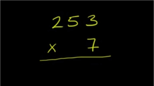 let's multiply seven seven times 253 and see what we get so just like in the last example what I like to do is I like to rewrite the first the largest number first so that's 253 and then write the smaller number below it and align the place value the seven it only has a ones place so I'll put the seven right over here below the ones place in 253 and then put the multiplication symbol right over here so you could read this as 253 times seven which we know is the same thing as 7 times 253 and now we are ready to compute and there are many ways of doing this but this would you could call the standard way so what I do is I start with my 7 and I multiply it times each of the numbers up here and I carry appropriately so first I start with 7 times 3 well 7 times 3 we know is 21 let me write that down 7 times 3 is equal to 21 you could do this part in your head but I just want to make it clear where I'm getting these numbers from what I would do in the standard method is I would write the 1 into 21 down here but then carry the 2 to the tens place now I want to figure out what 7 times 5 is now I want to figure out what 7 times 5 is we know from our multiplication tables that 7 times 5 is equal to 35 now we can't just somehow put the 35 down here we still have to deal with this 2 that we carried so we compute 7 times 5 is 35 but then we also add that 2 so it's 35 plus 2 is 37 now we write the 7 right over here in the tens place and carry the 3 carry the 3 now now we need to compute what 7 times 2 is we know that 7 times 2 is 14 from our multiplication tables we can't just put a 14 down here we have this 3 to add so we 7 times 2 is 14 plus 3 is 17 so now we can write the 17 down here because 2 is the last number that we have to deal with and so we have our answer seven times 253 is 1700 and anyone