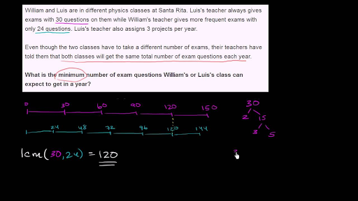 William and Louise are in different physics classes at Santa Rita Louise's teacher always gives exams with 30 questions on them while Williams teacher gives more frequent exams with only 24 questions Louise's teacher also assigns three projects per year even though the two classes have to take a different number of exams their teachers have told them that both classes let me underline both classes will get the same total number of exam questions each year what is the minimum number of exam questions Williams or Lewis's class can expect to get in a given a year so let's think about what's happening so if we think about Louis's teacher who gives 30 questions per test so after the first test he would have done 30 questions then after so this is zero right over here then after the second test he would have done 60 then after the third test he would have done 90 and after the fourth test he would have done 120 and after the fifth test if there is a fifth test he would do so this is if they had that made test he would get to 150 total questions and we could keep going on and on looking at all the multiples of 30 so this is probably a hint of what we're thinking about working at multiples of the numbers we want the minimum multiples or the least multiple so that's what Louise well what's going on with William well William's teacher the first after the first test they're going to get 224 questions 24 then they're going to get 248 after the second test then they're going to get to 72 72 after the third test then they're going to get to 96 I'm just taking multiples of 24 they're going to get to 96 after the fourth test and then after the fifth test they're going to get to 120 and if there's a sixth test then they would get to 144 they would get to 144 and we could keep going on and on and there let's see what they're asking us what is the minimum number of exam questions Williams or Lewis's class can expect to get in a year well the minimum number is the point at which they've gotten the same number of exam questions despite the fact that the tests had different number of items and you see the point at which they have the same number is that a and 20 this happens at 120 they both can have exactly 120 questions even though Lewis's teachers giving 30 at a time and even though Williams teachers giving 24 at a time and so the answer is 120 and notice they had a different number of exams Lewis had one two three four exams while William would have to have one two three four five exams but that gets them both to 120 total questions now thinking of it in terms of some of the math notation or the or the least common multiple notation we've seen before this is really asking us what is the least common multiple of 30 and of 30 and 24 and that least common multiple is equal to is equal to 120 now there's other ways that you can find the least common multiple other than just looking at the multiples like this you can look at it through prime factorization 30 is 2 times 15 which is 3 times 5 so we could say that 30 is equal to 2 times 3 times 5 and 24 24 that's a different color in that blue 24 is equal to 2 times 12 12 is equal to 2 times 6 6 is equal to 2 times 3 so 24 24 is equal to 2 times 2 times 2 times 3 so another way to come up with the least common multiple if we didn't even do this exercise up here it says look the number has to be divisible by both 30 and 24 if it's going to be divisible by 30 it's going to have to have 2 it's going to have to have 2 times 3 times 5 in its prime factorization that is essentially 30 so this makes it divisible by 30 and say well in order to be divisible by 24 it's going to need to its prime factorization is going to need 3 2s and a 3 well we already have one 3 and we already have 1 2 so we just need 2 more twos so 2 times 2 so this makes it so this makes it let me score a little bit this right over here makes it divisible by 24 and so this is essentially the prime factorization of the least common multiple of 30 and 24 you take any one of these numbers away you are no longer going to be divisible by one of these two numbers if you take a 2 away you're not going to be divisible by 24 anymore if you take a 2 or 3 away if you take a if you take a if you take a 3 or a 5 away you're not going to be divisible by 30 anymore and so if you were to multiply all these out this is 2 times 2 times 2 is 8 times 3 is 24 times 5 is it is 120 now let's do one more of these oh mama just bought one package of 21 binders we write that number down 21 binders she also bought a package of 30 pencils 30 pencils she wants to use all of the binders and pencils to create identical sets of office supplies for her classmates what is the greatest number of identical sets well mam what can make using all of the supplies so the fact that we're talking about greatest is clue that it's probably going to be dealing with greatest common divisors it's also dealing with dividing these things we want to divide these both into the greatest number of identical the greatest number of identical sets so there's a couple of ways we could think about let's think about what the greatest common divisor of both these numbers are or I could even say the greatest common factor the greatest common divisor of 21 21 and 30 so what's the largest number that divides into both of them so we could go with the prime factor we could list all of their normal factors and see what is the greatest common one or or we could say we could we could look at the prime factorization so let's just do the prime factorization method so 21 is the same thing as 3 times 7 these are both prime numbers 30 is let's see it's 3 I check it write it this way it is 2 times 15 we already did it actually just now and 15 is 3 times 5 so what's the greatest what's the largest number of prime numbers that are into both factorizations well you only have a three right over here there you'll have a three times anything else so this is just going to be equal t