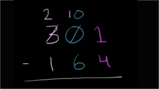 let's try to subtract 164 from 301 and I encourage you to pause this video and try it on your own first so let's go place by place and we can realize where we have to do some borrowing or regrouping so the ones place we have an issue 4 is larger than 1 how do we subtract a larger number from a smaller number we also have an issue in the tens place 6 is larger than 0 how do we subtract 6 from 0 so the answer that might be jumping into your head is oh we've got to do some borrowing or some regrouping but then you might be facing another problem you would say ok well let's try to borrow from the tens place here so we have a 1 if we could borrow 10 from the tens place could be at 11 but there's nothing here in the tens place there's nothing to borrow so what do we do so the way I would tackle it is first borrow for the tens place so we have nothing here so let's regroup a hundred from the hundreds place so that's equivalent to borrowing a 1 from the hundreds place so that's now a 2 and now in the tens place instead of a 0 instead of a 0 we are going to have a 10 now let's make sure that this still makes sense this is 200 plus 10 10 10 10 is a hundred plus 1 200 plus 100 plus 1 is still 301 so this still makes sense and the reason why this is valuable is now we have something to regroup from the tens place if we take one of these tens one of these tens so now we're left with nine tens and we give it we give it to the ones place so you give 10 plus one you're going to be left with you're going to be left with 11 and we can verify that we still haven't changed the value of the actual number 200 plus 90 is 290 plus 11 is still 301 and what was neat about this is now up here all of these numbers are larger than the corresponding number in the same place so we get we're ready to subtract 11 minus 4 11 minus 4 is let's see oh let's see 10 minus 3 is 7 so 11 minus 4 is 7 9 minus 6 is three and two minus one is one so we are left with 137