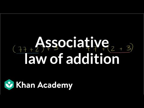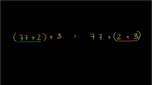 use the associative law of addition to write the expression and we have let's see a 77 plus 2 in parentheses plus 3 in a different way simplify both expressions to show they have identical results so this associative law of addition which sounds very fancy and complicated literally means then you can associate these three numbers in different ways or you can add them in different orders now let me just make that clear so the way they wrote it right here they wrote 77 77 plus 2 in parenthesis and then they wrote plus 3 these parenthesis mean do the 77 plus 2 before you add the 3 so if you were to evaluate this you would evaluate what's in the parenthesis first so you'd say well 77 plus 2 that's 79 so everything in the parenthesis just evaluates to 79 and then you still have that plus 3 and 79 plus 3 is 82 so this is equal to 82 that's if you just evaluate it the way that they gave it to us now the associative law of addition tells us it doesn't matter whether we add 77 and 2 first or whether we add 2 and 3 first we can associate them differently so this is going to be the exact same thing this is the exact same thing as we could write it this way so let me write them all 77 plus 2 plus 3 and we have no parentheses here this is actually the same thing as this over here because we'd go 77 plus 2 is 79 plus 3 is 82 but the associative law tells us well you know what I can do 77 plus 2 Plus 3 I could add this first and then add it to 77 it's going to be the exact same thing as if I add these two guys first and then add the 3 and let's let's verify that for ourselves so 2 plus 3 is 5 so this evaluates to 77 plus 5 77 + 5 + 77 + 5 once again is 82 is 82 so it doesn't matter how you associate the numbers either way you get 82 and that's the associative law of addition