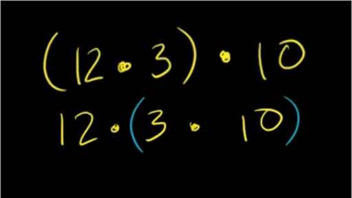use the associative law of multiplication to write and here they have 12 times 3 in the parentheses and then we want they want us to multiply that times 10 in a different way simplify both expressions to show they have identical results so the way that they wrote it is let me just rewrite it so they have 12 times 3 in parentheses and then they multiply that times 10 now whenever something is in parenthesis that means do that first so this literally says let's do the 12 times 3 first now what is 12 times 3 it's 36 so this evaluates to 36 and then we still have that times 10 over there times 10 and we know the trick whenever we multiply something times a power of 10 we just add the number of zeroes that we have at the back of it so this is going to be 360 this is going to be equal to 360 now the associative law of multiplication once again sounds like a very fancy thing all that means is it doesn't matter how we associate the multiplication or it doesn't matter how we put the parentheses we're going to get the same answer so let me write it down again if we were to do 12 times 3 times 10 if we just wrote it like this without parentheses if we just want left-to-right that would that would essentially be exactly what we just did here on the left but the associative law of multiplication says you know what we can multiply the 3 times 10 first and then multiply the 12 and let's see we're going to get the exact same answer as if we multiply the 12 times the 3 and then the 10 so let's just let's just verify it for ourselves so 3 times 10 3 times 10 is 30 and we still want to multiply the 12 times that it was 12 times 30 and we've seen this several times before you can view it as a 12 times 3 which is 36 but we still have this 0 here so that is also equal to 360 so it didn't matter how we associated the multiplication you could do the 12 times 3 first or you could do the 3 times 10 first either way they both evaluate it 160