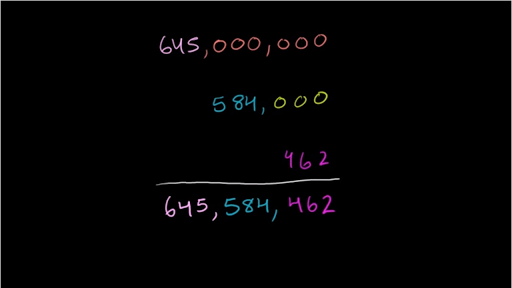 right 645 million five hundred eighty-four thousand four hundred sixty-two in standard form so let's tackle this piece by piece so the first part we have six hundred and forty five million six hundred and forty five million so let's think about that so we have six hundred and forty five six hundred and forty five but it's not just 645 we have 645 millionths so we could view that as 645 times times 1 million 1 million is 1 followed by six zeros so this piece right here is this right over here that is 645 million and what is that when we write it out if we were to multiply this out this is equal to it would be 645 times this one with six zeros behind it so this would be equal to 600 I'll write it like this this is equal to 645 and then we have our six zeros one two three one two three that's just this part of the number and I'm going to do it kind of slow and do it do all of the different parts of the problem but once you get some practice you'll find that these are a bit second nature and you won't have to go through all these steps you'll just be able to write the number now let's move on to the next part we have 584 let me write that down 500 and make sure let me write it like this we have well write like this five hundred and eighty four thousand five hundred and eighty four thousand so let me write the thousand so five hundred eighty four thousand so it's five hundred eighty four times 1000 and what's that going to look at so that that's this whole part right here so 584 times 1000 is equal to what what's going to be 584 with three zeros behind it or we could view it as 580 four times the one and you're gonna have three zeros in the final answer so it's going to be five hundred and eighty four five hundred and eighty four thousand you have our three zeros at the end five eighty four three zero so that's that part and then finally we have 462 462 and that's just 462 straight up but you could view it as 462 ones so then you just have 462 which obviously equals just 462 now our number is all of these combined it is 645 million and 584 thousand and 462 so one way to think about is that you could add these three numbers so if we were to add them if we were to add them we get 645 million 645 million five hundred and eighty four thousand five hundred and eighty four thousand four hundred and sixty to 462 now I said it'll become a little bit of second nature to you in a little bit and the and the way to think about that the easiest way to think about that is millions will have six zeros behind them thousands will have three zeros behind them and just well regular numbers have no zeros behind them so what you can do when you kind of want to learn a second nature you'll just look at the 645 million so you'll write 645 and you'll kind of keep in the back of your mind that you're going to have to have six more digits to the right of this and then you say five hundred and eighty four thousand so then you have your five hundred and eighty four thousand so then you write that down five hundred and eighty four thousand keeping in mind that you're going to need three digits to the right of that and so if they didn't tell us 462 we would just put three zeros here and that would also fulfill the six zeros we need behind 645 million but then they tell us 462 so we just write that right here 462