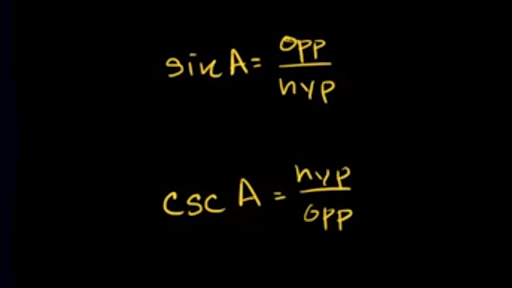 Determine the six trigonometric ratios for angle A in the right triangle below. So this right here is angle A, its in vertex A and help me remember the definitions of the trig ratios, these are human constructed definitions that have ended up being very, very useful for analyzing a whole series of things in the world and to help me remember them, I use the word, SOH-CAH-TOA let me write that down, so SOH-CAH-TOA sometimes you can think of it as one word, but its really the three parts that define atleast three of the trig functions for you, then we can get the other three by looking at the first three, so SOH tells us that sin of an angle, in this case its sin of A, so sin of A is equal to the opposite opposite, thats the o over the hypotenuse so opposite over the hypotenuse, well in this context what is the opposite sin to angle A? so we go across the triangle it opens up onto side BC, it has length 12, so that is the opposite side. So this is going to be equal to 12, and whats the hypotenuse? well, the hypotenuse is the longest side of the triangle; it's opposite to the 90 degree angle, and so we go opposite the 90 degree angle the longest side is side AB, it has length 13, so this side right over here is the hypotenuse, and so the sin of A is 12/13ths. now lets go to CAH CAH defines, cosine for us. it tells us that cosine of an angle, in this case, cosine of A is equal to the adjacent side, the adjacent side to the angle over the hypotenuse, over the hypotenuse. so whats the adjacent side to angle A? well if we look at angle A, there is 2 sides next to it. One of them is the hypotenuse the other one has length 5, the adjacent one is side CA so its 5, and what is the hypotenuse, well we've already figured that out, the hypotenuse right over here its opposite the 90 degree angle, it the longest side of the right triangle, it has length 13, so the cosine of A is 5/13ths and let me label this, this right over here is the adjacent side and this is all specific to angle A, the hypotenuse would be the same regardless of what angle you pick, but the opposite and adjacent is dependent on the angle we choose in the right triangle, now lets go to TOA. TOA defines tangent for us, it tells us that the tangent the tangent of an angle is equal to the opposite, equal to the opposite side over the adjacent side, so given this definition what is the tangent of A? well the opposite we already figured out has length 12, and the adjacent side we already figured out has length 5 so the tangent of A, which is opposite over adjacent is 12/5ths now we'll go to the other three trig ratios which you can think of as the reciprocals of these right over here, but I'll define them so first you have cosecant, and cosecant; its always a little bit unintuitive, why cosecant is the reciprocal of sine of A even though it starts with a co like cosine but cosecant is the reciprocal of the sin of A, so sin of A is opposite over hypotenuse. Cosecant of A is hypotenuse over opposite and so whats the hypotenuse over the opposite, well hypotenuse is 13 and the opposite side is 12 and notice 13/12ths is the reciprocal of 12/13ths now, secant of A is the reciprocal so instead of it being adjacent over hypotenuse, which we got out of the CAH part of SOH CAH TOA, its hypotenuse over adjacent so what is the secant of A? well the hypotenuse, we figured out multiple times is 13 and what is the adjacent side? it is 5, so 13 13/5ths, which is once again the reciprocal of cosine of A, 5/13ths finally lets get the cotangent, and the cotangent is the reciprocal of the tangent of A, instead of being opposite over adjacent it is adjacent over opposite, so what is the cotangent of A? well we figured out the adjacent side multiple times for angle A, its 5 and the opposite side to angle A is 12, so 5/12ths which is once again the reciprocal of the tangent of A which is 12/5ths