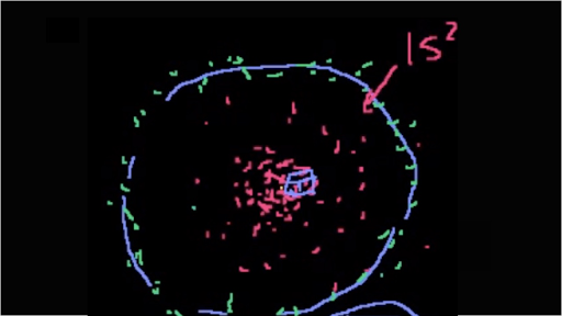 In the last few videos we learned that the configuration of electrons in an atom aren't in a simple, classical, Newtonian orbit configuration. And that's the Bohr model of the electron. And I'll keep reviewing it, just because I think it's an important point. If that's the nucleus, remember, it's just a tiny, tiny, tiny dot if you think about the entire volume of the actual atom. And instead of the electron being in orbits around it, which would be how a planet orbits the sun. Instead of being in orbits around it, it's described by orbitals, which are these probability density functions. So an orbital-- let's say that's the nucleus it would describe, if you took any point in space around the nucleus, the probability of finding the electron. So actually, in any volume of space around the nucleus, it would tell you the probability of finding the electron within that volume. And so if you were to just take a bunch of snapshots of electrons -- let's say in the 1s orbital. And that's what the 1s orbital looks like. You can barely see it there, but it's a sphere around the nucleus, and that's the lowest energy state that an electron can be in. If you were to just take a number of snapshots of electrons. Let's say you were to take a number of snapshots of helium, which has two electrons. Both of them are in the 1s orbital. It would look like this. If you took one snapshot, maybe it'll be there, the next snapshot, maybe the electron is there. Then the electron is there. Then the electron is there. Then it's there. And if you kept doing the snapshots, you would have a bunch of them really close. And then it gets a little bit sparser as you get out, as you get further and further out away from the electron. But as you see, you're much more likely to find the electron close to the center of the atom than further out. Although you might have had an observation with the electron sitting all the way out there, or sitting over here. So it really could have been anywhere, but if you take multiple observations, you'll see what that probability function is describing. It's saying look, there's a much lower probability of finding the electron out in this little cube of volume space than it is in this little cube of volume space. And when you see these diagrams that draw this orbital like this. Let's say they draw it like a shell, like a sphere. And I'll try to make it look three-dimensional. So let's say this is the outside of it, and the nucleus is sitting some place on the inside. They're just saying -- they just draw a cut-off -- where can I find the electron 90% of the time? So they're saying, OK, I can find the electron 90% of the time within this circle, if I were to do the cross-section. But every now and then the electron can show up outside of that, right? Because it's all probabilistic. So this can still happen. You can still find the electron if this is the orbital we're talking about out here. Right? And then we, in the last video, we said, OK, the electrons fill up the orbitals from lowest energy state to high energy state. You could imagine it. If I'm playing Tetris-- well I don't know if Tetris is the thing-- but if I'm stacking cubes, I lay out cubes from low energy, if this is the floor, I put the first cube at the lowest energy state. And let's say I could put the second cube at a low energy state here. But I only have this much space to work with. So I have to put the third cube at the next highest energy state. In this case our energy would be described as potential energy, right? This is just a classical, Newtonian physics example. But that's the same idea with electrons. Once I have two electrons in this 1s orbital -- so let's say the electron configuration of helium is 1s2 -- the third electron I can't put there anymore, because there's only room for two electrons. The way I think about it is these two electrons are now going to repel the third one I want to add. So then I have to go to the 2s orbital. And now if I were to plot the 2s orbital on top of this one, it would look something like this, where I have a high probability of finding the electrons in this shell that's essentially around the 1s orbital, right? So right now, if maybe I'm dealing with lithium right now. So I only have one extra electron. So this one extra electron, that might be where I observed that extra electron. But every now and then it could show up there, it could show up there, it could show up there, but the high probability is there. So when you say where is it going to be 90% of the time? It'll be like this shell that's around the center. Remember, when it's three-dimensional you would kind of cover it up. So it would be this shell. So that's what they drew here. They do the 1s. It's just a red shell. And then the 2s. The second energy shell is just this blue shell over it. And you can see it a little bit better in, actually, the higher energy orbits, the higher energy shells, where the seventh s energy shell is this red area. Then you have the blue area, then the red, and the blue. And so I think you get the idea that each of those are energy shells. So you kind of keep overlaying the s energy orbitals around each other. But you probably see this other stuff here. And the general principle, remember, is that the electrons fill up the orbital from lowest energy orbital to higher energy orbital. So the first one that's filled up is the 1s. This is the 1. This is the s. So this is the 1s. It can fit two electrons. Then the next one that's filled up is 2s. It can fill two more electrons. And then the next one, and this is where it gets interesting, you fill up the 2p orbital. 2p orbital. That's this, right here. 2p orbitals. And notice the p orbitals have something, p sub z, p sub x, p sub y. What does that mean? Well, if you look at the p-orbitals, they have these dumbbell shapes. They look a little unnatural, but I think in future videos we'll show you how they're analogous to standing waves. But if you l