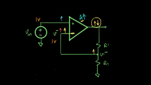 let's look at what happens if V out goes up. And what happens to V minus in this case? Well V minus goes in what