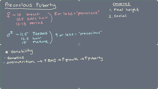 i'm here at stanford medical school with Morgan Theis and Dr. Laura Bachrach and they're going to teach us some things. Okay, so what are we going to learn about today? I'd like to talk about precocious puberty it seems to be on the minds of many parents these days they worry that their child is developing too early, they worry their child is going too small as a result, they worry their child is going to get picked on, and they worry they might have done something wrong. Fed the child the wrong food, or exposed them to the wrong videos, to cause this all to happen. So could we just talk about what precocious puberty means, it almost sounds like they've done something too soon, is that correct? It's exactly true. The normal process of puberty, in a girl, we think, we used to think, started around the aged of 10, with a little bit of breast development. And around 6 months later, the girls would get a little bit of pubic hair, and around the age of 12 and 3/4 to 13 they'd get their first period. Ok. In boys, we used to think, the process was starting a little later, at about 11 and a half. The boys would get some enlargement of the testes. They'd get some pubic hair about a year later. And by age 15 or so, they'd be mature. We have a definition of what's precocious, uh, when there's signs of puberty before 8, in a girl, or before 9, in a boy. Ok. So, 8 or less in a girl, would be precocious, and that's for the breast development? For any signs of puberty: the breasts, the pubic hair or the period would be precocious if it happened before the age of 8 in a girl. And in a boy, before the age of 9. Now this has become a little bit controversial because there was one very large pediatric study that involved over 17 000 girls that found that as many as 25% of african american girls would have sign of puberty before 8, and as many 7% of the white girls had some signs of puberty before age 8. But we're still basically using these guidelines. Not to say that this is definetely abnormal, but this is something we're going to evaluate. If we see signs of puberty before those age landmarks. Ok, so it sounds like there's a lot of variability, it's kind of hard to know in any individual case, whether it's normal or not, but we have to have some kind of threshold for which we're going to work someone up to make sure everything is normal. You hit on a really important word. And that is variability. And a lot of this variability, uh, is determined by genetics. So part of what we always need to know is the timing of development in the family. So when did mom get her first menstrual period, when did dad get his puberty and growth spurt? So that's part of it, genetics, and we need to know that, take that into account: If mom had her first period at 10 and started her breasts at 8 it might be perfectly normal for her daugher. If mom's period were at 14 and her daughter has breast development at 7 and a half it's more worrysome. Ok. Ok, the second factor that seems to be contributing, potentially, is the overnutrition of our young people. Oh, yes. And in the particular study that I mentioned to you, where they looked at over 17 000 children, at least for the white population, the could explain the earlier signs of puberty as an association with a high body mass index. So it looked as if, if you overnourish your child you may speed along their growth, and eventually, potentially, speed along the onset of puberty. Now, this did not hold up as an association in the african american population, so there's other factors going on there. But that's something that we rtake into account. THe bottom line is, the child may present with some signs of early puberty, mom or dad get worried, they go to the pediatrician, and the pediatrician has to decide what's going on. Ok, now, JUST Backing up a little bit, is this a problem? I mean, what's the problem with, say, a 7 year old girl starting puberty, or, uh, an 8 year old boy starting puberty early? I imagine there could be some social implications (as you mentionened) but what are sort of the things we worry about? Well, that's an important question, because it comes up not only how far do we go to evaluate them, but how far do we go to treat them? So, one of the concerns parents have, relates to their final height. So, if they start their growth spurt early in life, and close it off early in life, are them gonna cheat themselves out of some final height? Right. So height is a concern. And its impact really depends upon how young the child is. A three year old going into puberty is definetely going to end up short if we don't do something. A seven and a half old girl is probably not going to be altered by this in terms of height. The second concern is definetely what you brought up, in terms of social concern. Parents worry their child may behave in an older way, or be treat in a way that they're not quite ready for. They mey get unwarranted attention from people because they look older. And there is even potential concern for abuse, sexual abuse. Um, right. So those are the usual parental concerns for why they bring the child in. The other concern they have is, often "what am I doing wrong". There are a lot of questions about "should I have fed my child organic food?" "what about the soap i was using?" "what about the soap operas my child was watching?" You know, they're really concerned about something they might have done. And they worry about these additives in ourplastics, in our theeth sealants, etc... They worry about evils inour environment. Okay. So things that you address in the visit that you have with them are definetely some of the, the concerns that parent have about what they could have done differently. Exactly. We start out, assessing in a sort of a systematic way. The first question we want to know, is when did this all start? And what did they notice. And it's really important to break down the signs of puberty, because different hormones contribute to th