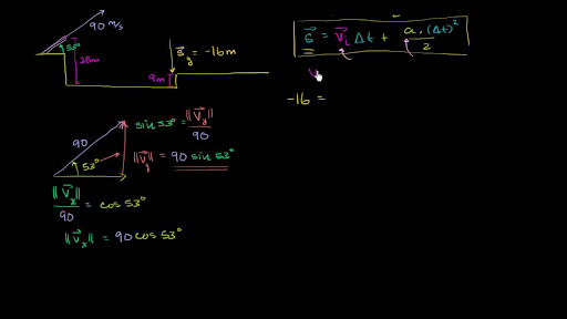 let's do a slightly more complicated two-dimensional projectile motion problem now so in this situation I am going to I am going to launch the projectile off of a platform off of a platform and then it is going to land on another platform it is going to land on another platform and I'm going to fire the projectile I'm going to fire the projectile at an angle let me draw this a little bit better so I'm going to fire the projectile at an angle of let me use a not-so-clean number let's say it is 53 it's a 53 degree angle and it's coming out of the cannon so and the and let me make it clear so it's coming out let me do it this way just to make it 100% clear so so this angle right over here is 53 degrees 53 degrees and we are going to have it come out of the muzzle of the cannon with a velocity of 90 meters per second 90 meters per second and just to give ourselves a sense of the heights or how high it's being launched from so the from the muzzle of the cannon down to here so this height right over here this height right over there let's say that that is 25 meters and let's say that this height right over here this height right over here let's say that that is 9 meters 9 meters and so we're essentially launching this from a height of 25 meters I know in the last video and the last video even though I drew the cannon like this we assumed that it was being launched from an altitude of 0 and then landing back at an altitude of 0 here we're assuming we're launching it from an altitude of 25 meters because that's when it's leaving the muzzle and it's going to start decelerating at least in the vertical direction as soon as it leaves the muzzle and then we're assuming it's not going to land back at the same altitude it's going to land at a different altitude so how do we think about this problem so the first thing you'll always want to do is is divide your velocity vector into its horizontal and vertical components you use the vertical component to figure out how long it's going to stay in the air and then you use the horizontal component to figure out given how long it's in the air how far did it travel and once again we're going to assume that air resistance is negligible so just based on what we did in the last video and I'll work through it relatively I'll go through all of the steps in this one as well the vertical so if we draw our vector we're draw our vector the length here is going to be 90 the angle over here this is our velocity vector the angle over here between the x-axis and our vector is 53 degrees and let me draw the horizontal component the horizontal component would look like this and the vertical component I'll do it in orange the vertical component would look like that's not Orange the vertical component will look like the vertical component would look like this and so the vertical component of the vector what would be the length of this side right over here well this is the opposite side this is the opposite side we know from from basic trigonometry sine of an angle is opposite over the hypotenuse so we know that we know that the sine the sine of 53 degrees is equal to this opposite side is equal to is equal to the vertical velocity is equal to the vertical velocity and it I won't well is equal to the vertical velocity and I could write it it's the magnitude of the vertical velocity I'll write that subscript Y because we're in the Y direction that's the vertical direction over the length of the hypotenuse over the magnitude of our original vector or we can get we can get that this side right over here if we multiply both sides by 90 we get that the magnitude of that side is going to be equal to is equal to 90 times the sine of 53 degrees 90 times the sine of 53 degrees now if we want to if we want to do the horizontal component the horizontal side is adjacent to this cosine sohcahtoa cosine is adjacent over hypotenuse is it J and over hypotenuse so the component the the horizontal component of our velocity I'll say in the X direction over the hypotenuse over 90 over 90 is equal to the cosine of 53 is equal to the cosine of 53 degrees cosine is adjacent over hypotenuse adjacent that's this length over 90 multiply both sides by 90 you get that the horizontal component the horizontal component is equal to 90 is equal to 90 times cosine of 53 degrees times the cosine of 53 degrees now how do we figure out how long this thing stays in the air well we'll use the vertical component for that we'll use the vertical component for that and since we're dealing especially since we're dealing with different levels we can't use that more basic reasoning that hey whatever velocity we start off at it's going to be the same velocity but in the opposite direction or the same magnitude of velocity but the opposite direction because we're not going to the same elevation but we could do is we can use the formula that we derived in the previous in the previous video that the displacement let me just copy and paste this a little bit lower so we can use it so let me copy it and then let me paste it so I'll stick it right over here so we could use this we know that the displacement is equal to the initial velocity and we're dealing with the vertical direction right here times the change in time plus the acceleration times the change in time squared divided by two so how do we use this to figure out how long we're in the air so what is the displacement if we're starting at 25 meters we're starting at 25 meters high and we're going to 9 meters high so over the course while this thing is traveling it will displaced it will be displaced downwards 16 meters it will be displaced downwards 16 meters or another way to think about it is our displacement our displacement in the vertical direction is going to be equal to negative 16 meters let me write that a little bit bigger negative 16 meters right because 25 minus 9 is 16 and so we can put that into the formula that we derived in the previous video we get nega